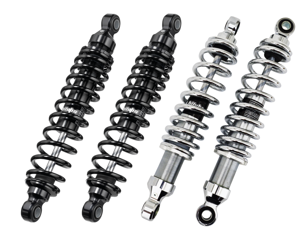 Designed and made in Italy. Bitubo WMB series Nitrogen filled hydraulic shocks improve riding comfort and vehicle control. Most significant is that the damper units are fitted "upside down". These shocks feature adjustable spring preload and are available for most Harley models. Spring covers are available as an accessory. Your model motorcycle is given together with the stock shocks length. Feel free to take longer or shorter shocks from the same application group, but note that shorter than stock shocks lower the rear of the motorcycle. Fender to tire clearance should be checked after installation. Changing shock length will also change handling of your bike.