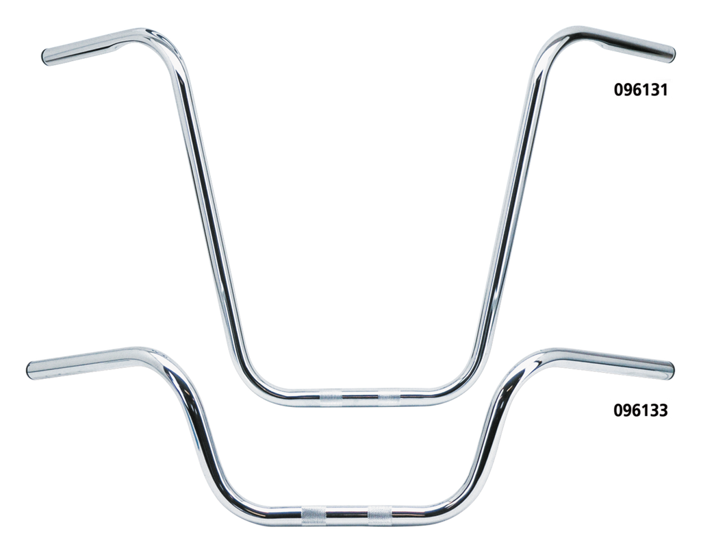 Ape Hanger handlebars have never been away. Zodiac's Ape Hangers are made from heavy gauge tubing, have precision mandrel bends and feature triple chrome plating or a tough black finish. Dimples allow easy installation of 1982 to present Harley-Davidson style handlebar controls. Knurled bars give the handlebar clamps more grip, knurl center-to-center distance is indicate at "G", so check if it matches your application. These bars are not suitable to convert to electronic Thottle-By-Wire.