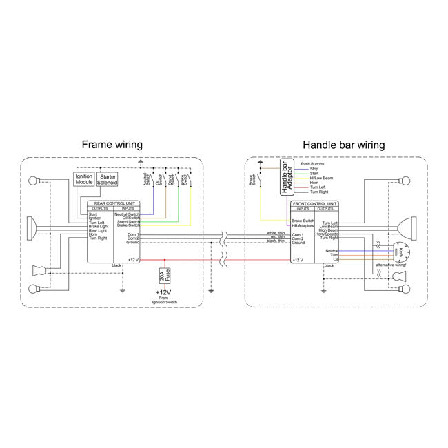 Harness C2; Used in combination with a AJ Elektronik brain box; Incl. C Box front and C Box rear + 2 handlebar wiring adapters. After installation of a brain box there is way less wiring, but there is still a lot to win. These digital wiring harnesses (or in fact sub-brain boxes) were designed to further simplify and reduce visible wiring. The universal Harness-C (C in the part name stands for Communication) for push button control enables a new way of clean 'bike control'. A small wiring adapter box at the handlebar (C Box front) and a small wiring adapter box on the rear (C Box rear) overtake complete control through thin serial wiring. The thicker wiring to power the users is connected to the brain box itself. Overall less meters of wiring, shorter wiring to the users and simpler and faster installations on newly built custom bikes.