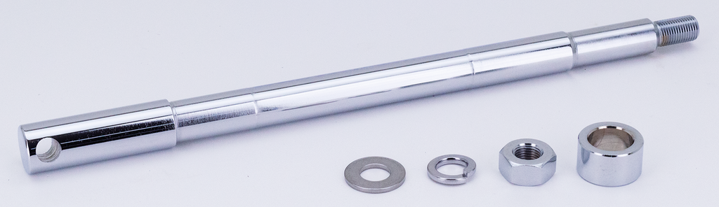 The widest selection of Chrome plated front and rear axles available today is offered to you by Zodiac. Axles for models as far back as 1936 and as recent as the latest models. Axle shaft is machined from heat treated Chrome-moly steel, triple Chrome plated, machine polished and then ground (after chroming) to a size tolerance of ±.0005". Rear axle nuts are penetration welded to the shaft and smoothly machined before polishing and plating. Please note that recent models often use the same OEM part number for the wheel axle, our kits however include the correct axle spacers for the models as listed.