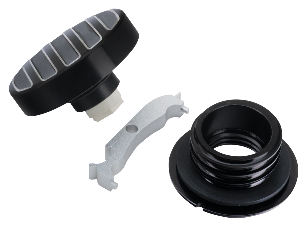 Billet aluminum caps to top off your gas tank. Order a matching LED fuel gauge or dummy cap when you have a tank with two caps and prefer a balanced look.