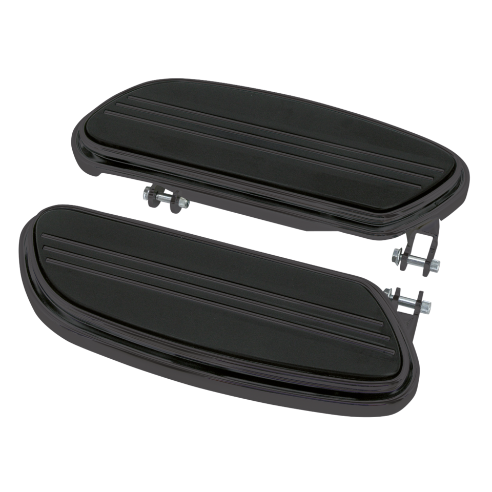 This kit extends the rider floorboards forward by about 1 1/2" (3.8 cm), providing the tall rider a comfortable riding position. Accepts original mounts and includes left and right footboards with rubber pads as shown. The pans are available in black or chrome finish. Fits 2002 to present Touring models with stock brake pedal.