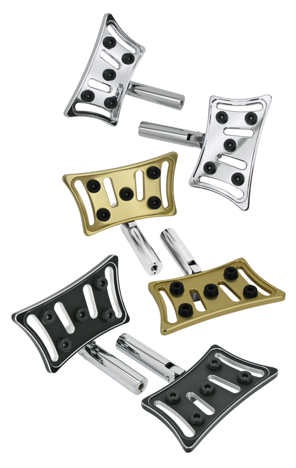 These billet aluminum floorboards add a great custom look to your bike. They are easy to install as they feature custom designed mounting brackets, ready to bolt on the stock floorboard mountings. The energy absorbing Zi-Cone rubber pads provide extra grip and comfort under any riding condition. Matching brake pedals, shifter pegs and passenger boards are also available. Replacement rubbers are sold in sets of 16.