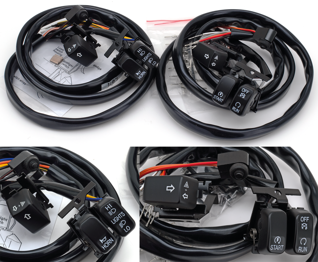 These ergonomic switches are for use on 1996 to present bikes with the rounded handlebar controls. The contoured switch rockers provide easier operation and improved recognition, even when wearing gloves. Switches feature better water resistance for improved reliability in wet weather conditions. Switches come completely pre-wired with color-coded 48" long wiring harness for easy installation. Available in Chrome with black lettering or black with white lettering, Chrome with combined black symbols, or black with white symbols in complete kits. According to the latest European type approval regulations switches with symbols must be used on new motorcycles. Lettered switches are also available individually. Kits include wire terminals, mounting screws and instructions. The 2007-up version has an extra switch on the clutch lever that operates the clutch interlock system.
