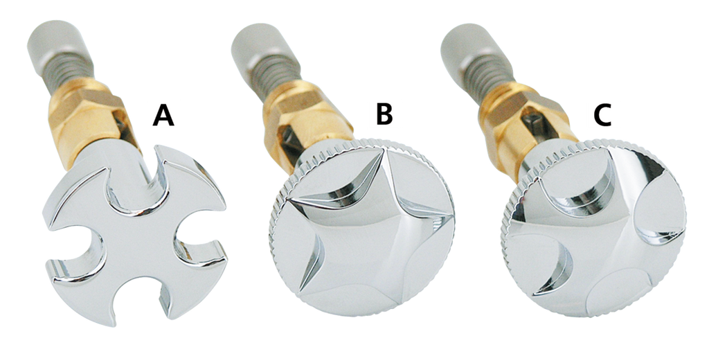 These designer style adjustable enrichment devices replace the fixed one on S&S Super E, Super G and Super B carburetors to make starting quicker and easier. The round style knobs have a knurled perimeter to give you a better grip. Knobs are chrome plated. Three great looking styles available.