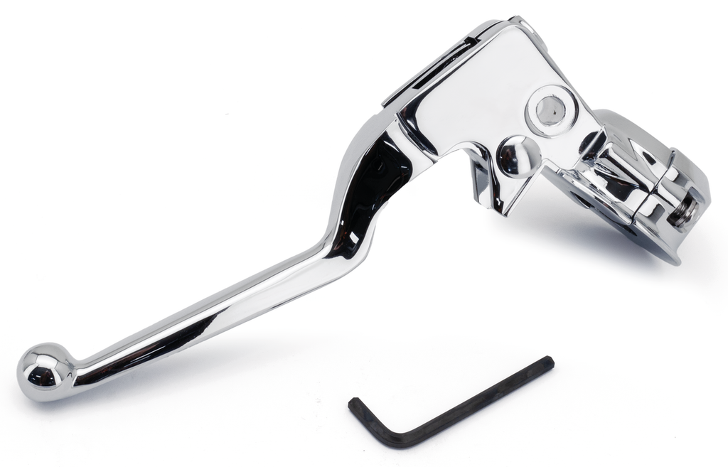 Chrome handlebar mounted brake and clutch control assemblies with switch housing for 1982-1995 models. Available in stock style or with our "Wide" lever blades installed. The "Wide" lever blades look very much the same as the 1993-1995 OEM parts, but you will notice the difference when you fit them. They are an ergonomic design with smoothed edges and approximately 10 degrees rotated blades, providing a superior and more comfortable grip. Switch housings will accept the OEM or OEM styled aftermarket switches. The master cylinder assembly comes complete with handlebar clamp, chrome mounting hardware and a banjo bolt. All parts are separately available.