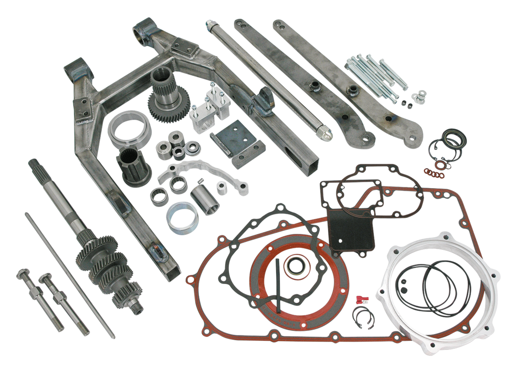 Since 2006 Dyna's come from "The Factory" with a complete new 6 speed transmission, completely changed primary, as well as a new swing arm and many changes to the frame. Reasons enough for us to design a completely new Wide Ass kit. This very complete Wide Ass wide tire conversion kit allows you to mount a 250 wide rear tire on a 8.50" wide rim in the stock Dyna frame and still keep the stock drive belt without trimming. The kit contains everything you need, being a raw or black powder coated extra wide Swingarm, 25mm diameter rear wheel axle, rear wheel axle adjusters, raw or powder coated brake caliper bracket, raw or powder coated fender struts that will take an up to 10 1/2" wide fender, extended upper shock mounting studs, a complete 25mm primary offset kit with a primary spacer ring, extended crankshaft extension with extended crankshaft nut, extended transmission main shaft, extended main drive gear with needle bearings and seal, extended belt pulley spacer, extended clutch push rod, primary-to-transmission spacers and all other required hardware to offset your primary. In fact all parts for 2006 to present models. Wheel, fender and wide rear tire are not included, we offer a wide variety of extra wide fenders, tires, rims and wheels for use with this wide swingarm elsewhere in this catalog.