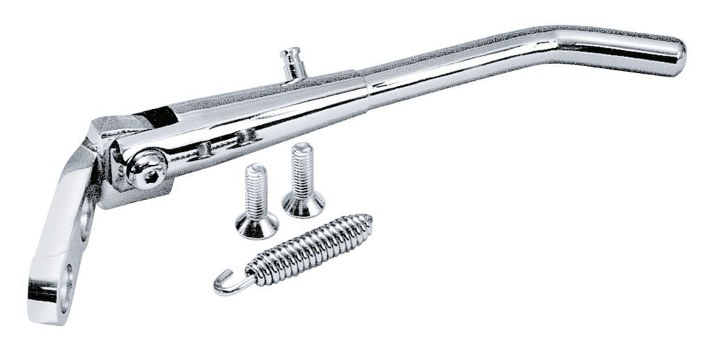 Takes a little bit more to fit than an "ordinary" bolt-on accessory, as you have to drill and tap two holes. But after this you will have that real special look and easy-to-use rear mounted kickstand. Kit includes XL-style kickstand, custom bracket, bolts and spring. All parts have a chrome plated finish. Available in stock length, as well as a shorter version for use on lowered bikes.