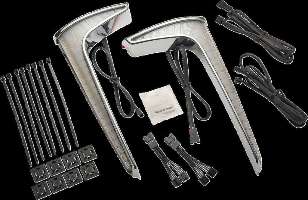 Fang® Lower Fairing LightsGHOST™ Lens Technology featuring a wide dispersion of light 104 LEDs per side and include bright white run lights and amber turn signals Improves side visibility No restrictions to air flow No drilling required Hassle-free installation with pre-applied 3M VHB adhesive backing Plug-n-play harness part #s 2120-1244 and 2050-0499 sold separately Indian CHALLENGER 108 ABS 2020-2025 Indian PURSUIT 108 ABS 2022-2025