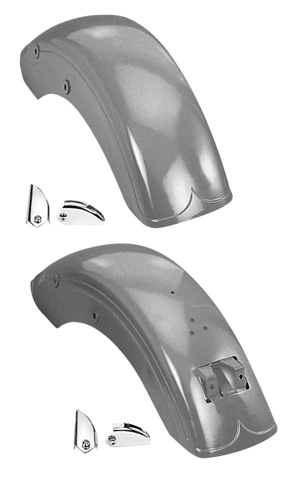 These stylish steel fenders enhance the look of all 1986 thru 1999 5 Speed Softail models. They sit a little over 1 1/2" (4 cm) lower as the stock fender and feature a seat to fender radius that perfectly matches lowered bikes. Most stock and aftermarket seats will fit, but some seats with a steel base require custom fitment. Fenders are available with or without the mounting bracket for the stock 1973-up taillight and have an early-style reveal stamped in the rear tips. The installation of these fenders requires you to cut 5" off your stock fender struts. The stock turn signals must be relocated, and the saddlebags on FLSTC models cannot be reinstalled due to the shortened fender struts. 1997 thru 1999 models require modification and/or relocation of the OEM fuse box. Two decorative end caps are supplied with each fender to finish off the shortened struts and add to their overall appearance.