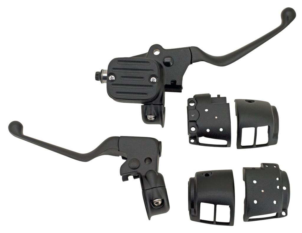 Complete handlebar control kits to fit 1996 thru 2010 Softail, 1996 thru 2011 Dyna, 1996 thru 2007 Touring and 1996 thru 2003 Sportster models. Comes complete with switch housings. Housings accept OEM and OEM style aftermarket switches. All hardware needed is included. Available with 9/16" bore Master cylinder for Single disc models and 11/16" for Dual disc models. The handlebar switch housings are a reproduction of the Original Equipment housings and will accept both OEM or aftermarket switches. All parts in these kits are available separately.