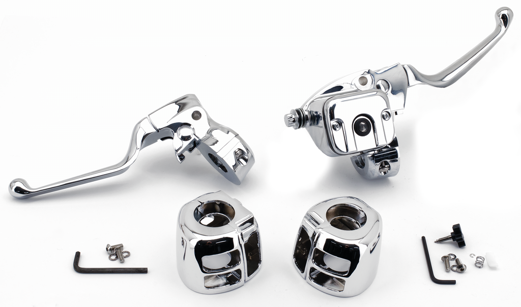 Custom-styled chrome plated handlebar control kit. Re-styled from the OEM controls as used on 1996 to present Big Twin and Sportster models. Kits contain complete front brake master cylinder, clutch lever with perch, left and right side switch housings, and all required hardware. Available with 9/16" and 5/8" bore master cylinder for single disc models, and 11/16" bore for dual disc models. The switch housings are a reproduction of the OEM housings, but with a show chrome quality finish. Switch housings accept both OEM and aftermarket switches for 1996 to present Sportster and 1996 thru 2006 Softail and Dyna.