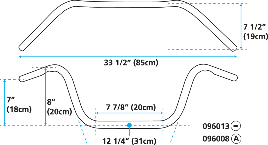 Ape Hanger handlebars have never been away. Zodiac's Ape Hangers are made from heavy gauge tubing, have precision mandrel bends and feature triple chrome plating or a tough black finish. Dimples allow easy installation of 1982 to present Harley-Davidson style handlebar controls. Knurled bars give the handlebar clamps more grip, knurl center-to-center distance is indicate at "G", so check if it matches your application. These bars are not suitable to convert to electronic Thottle-By-Wire.