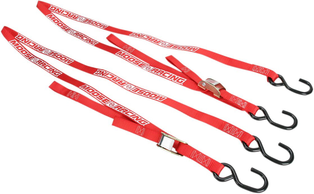 Heavy-Duty Tie-DownsHigh-quality tie-downs from a brand you trust Two oversized, high-strength rubber-coated hooks 1" wide straps are printed with Moose Racing logo Built-in soft tie helps prevent damage to your machine 7' long (1' longer than industry standard) ; 1,350-lb. break strength Made in the U.S.A. EU strap width 2,54 cm and are printed with Moose Racing logo. EU length 2,13 m (30,48 cm longer than industry standard) and break strength of 612,35 kg