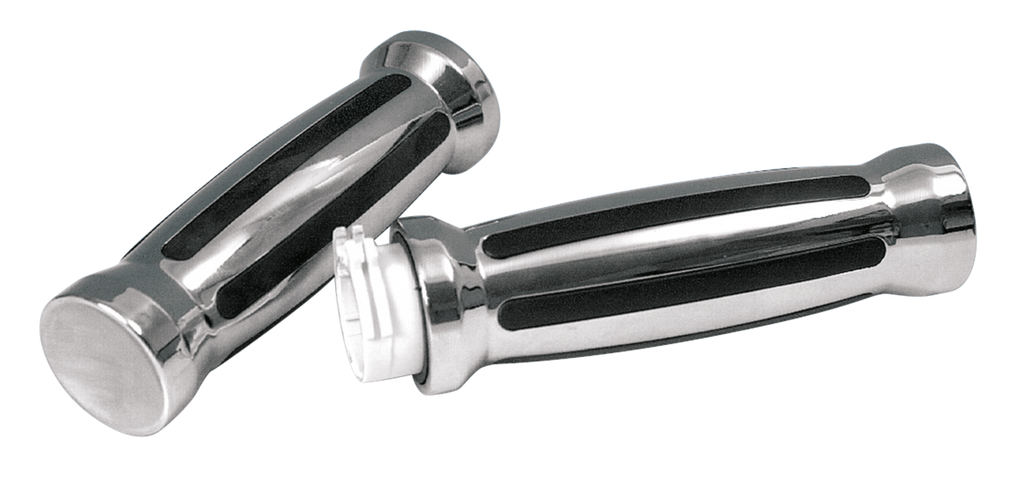 Fat looking and sensational feeling grips for your Harley. Features a one-piece rubber insert that protrudes through the chrome plated housing to absorb vibration. The throttle side grip comes with the nylon sleeve for single or dual cable application allready installed. Fits all models 1973 to present (except models with handlebar air reservoir).