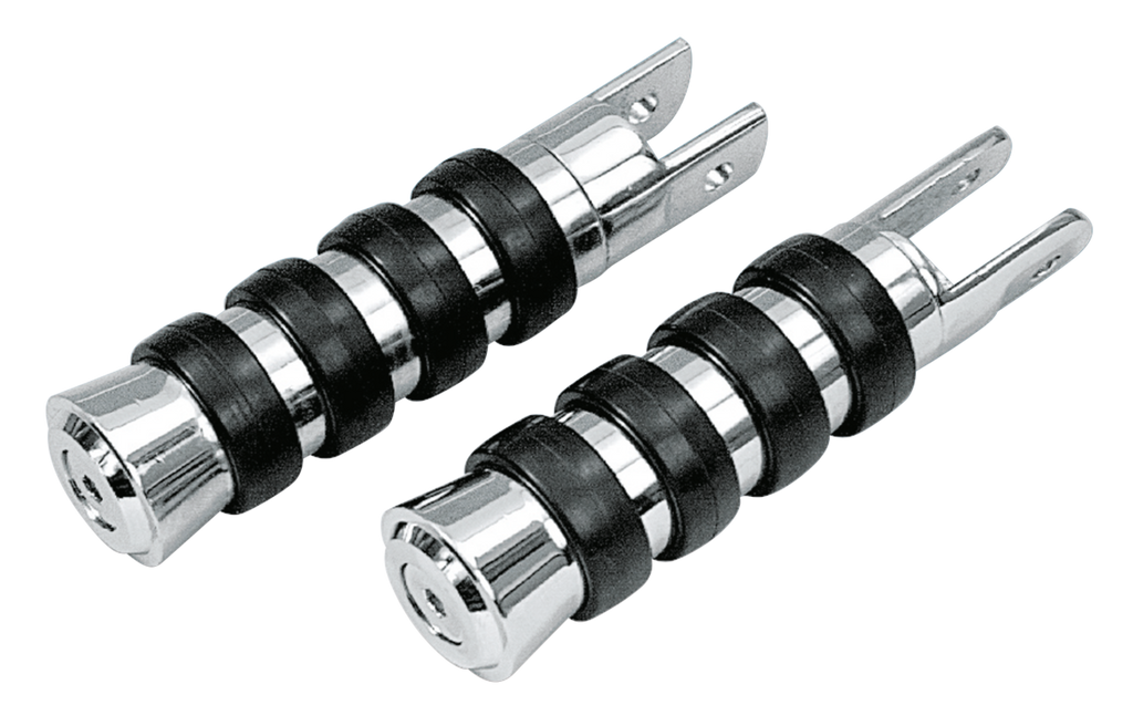Chrome plated foot pegs with wide rubber bands that not only look good, but are very functional too. The rubber bands stop your feet from slipping off the pegs, absorb vibrations and guarantee a comfortable ride.