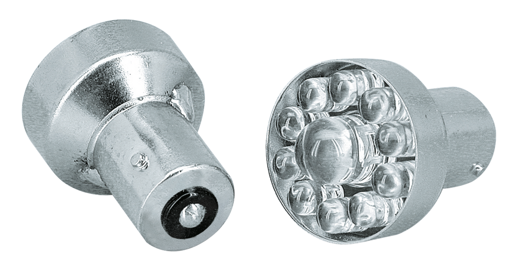 Bright shining 12 Volt LED replacement bulbs. Available in Bright Red that can be used to replace almost any taillight or running light bulb and Bright Amber that can be used to replace turn signal light bulbs. Also available with Clear LED's. Bulbs have a thick socket (BA15) and give a very special light effect. LED lights use only a fraction of the power normal bulbs do. Red, Amber and Clear bulbs are available in Single or Dual filament.