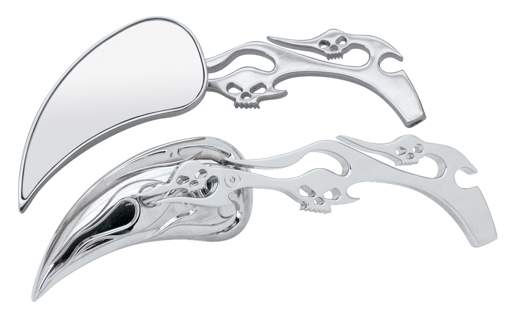 Meteor shaped mirror measures 5 3/8" wide and 2 3/8" high, with flamed backside. The heavy duty locking mechanism with swivel ball holds the mirror in its position, even under the toughest conditions. The 7 1/2" long stem features 3 Face Skulls. A perfect match with our Skull 3 Face style shifter rods (ZPN110073, 110077 and 110081). The chrome finished meteor mirror set will upgrade most stock mirrors, mounting hardware included. Sold in sets of left and right.