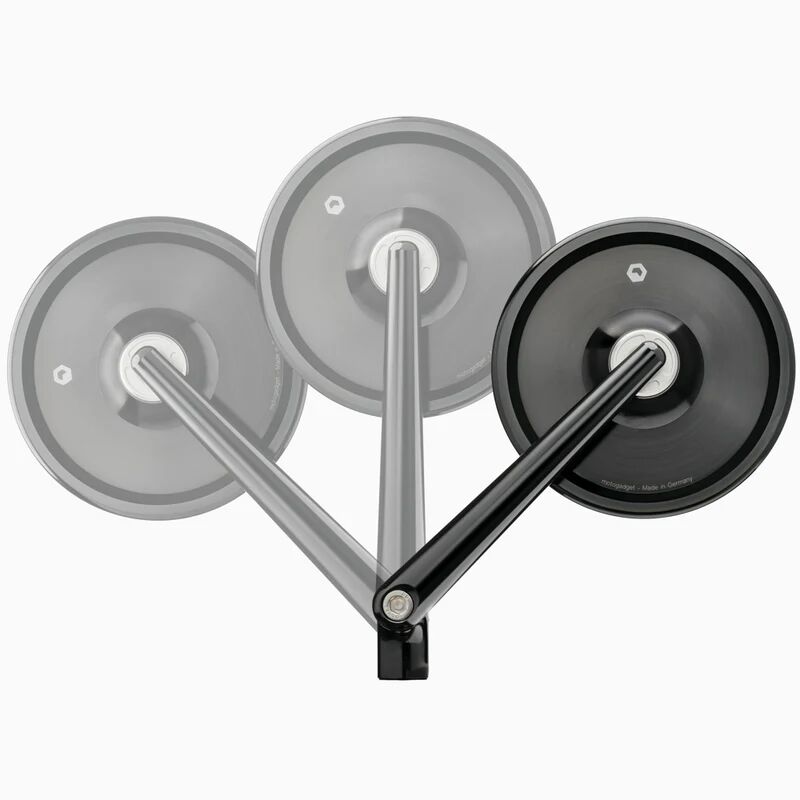mo.view Classic Flip 110 mm MirrorThe mirror with swivel mirror arm and defined 45° locking angles is perfect for narrow passages, during transportation or when there are space problems in the garage. Our glassless mirror series mo.view is unique in the world. The special feature of our mirrors is the patented mirror surface, which is worked directly from the metal of the body. The aluminium itself is the mirror surface. The mirror body itself becomes very thin and light, creating a weightless design with no rim or frame. The convex mirror surface is manufactured by fly cutting using diamond tools on ultra-precision machines in Berlin. It is then made resistant to oxidation, corrosion and abrasion by a complex plasma coating in a vacuum. The mirror body and mirror arm are milled from solid aluminium on CNC machines and anodized to a high quality. All screws are made of stainless steel. The precise ball joint allows the mirror to be adjusted comfortably and very stably. Glass breakage or glass falling out is simply not possible. A special feature of the mirrors in the flip series is the pivoting mirror arm with defined locking angles at 45° intervals. This allows the mirror to be tilted upwards as required without changing the mirror setting. Extremely practical for narrow passages, space problems in the garage or for transportation. The locking mechanism is very stable and cannot be adjusted accidentally. The mirror does not vibrate even at high speeds when mounted correctly. The surface-mounted mirror can be fitted to any M10 mirror thread on the handlebars. Three fixing screws with different threads are supplied. The mirror is suitable for the left and right side. Diameter of the mirror body: 99 mm. Thickness of the mirror body without ball head: 4.5 mm. Length of the mirror arm: 110 mm. Weight: approx. 300 g. Scope of delivery: 1x mo.view classic flip surface-mounted mirror (with ECE marking) with arm, 1 x screw M10 x 1.5, 1 x screw M10 x 1.25 right-hand thread, 1 x screw M10 x 1.25 left-hand thread & instructions manual.