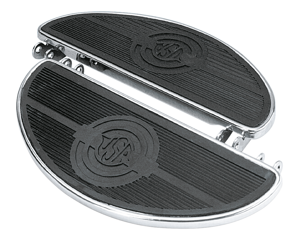 Beautifully chrome plated floorboard set, a perfect copy of the Harley-Davidson floorboards. Fits all Big Twin 1941 thru 1984. Features USA logo in rubber pad (OEM 50603-40).