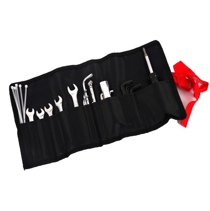 This motorcycle tool kit is packed full of handy tools, ideal for emergency repairs or tweaks on the go. Compact, lightweight and easy to store in a pack or under the saddle alike.