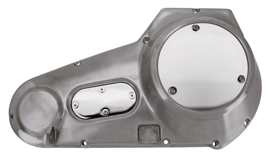 Complete 9-hole polished primary cover with 3-hole derby cover, inspection cover, gaskets, hardware and needle bearing. Fits 1970-1984 Shovelhead 4-speed models.