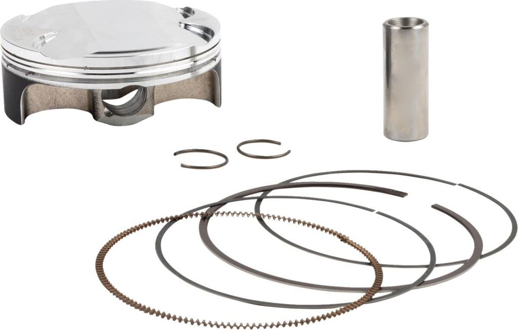 Piston KitPistons made are with high quality, permanent skirt coating to reduce friction and piston rock for quiet and improved performance Optimized machining for lightness, as well as maintained strength in key areas such as crown and skirt wall cross section Forged from aerospace grade aluminum alloy Piston kit includes piston, rings, pin and clips Kit Includes: