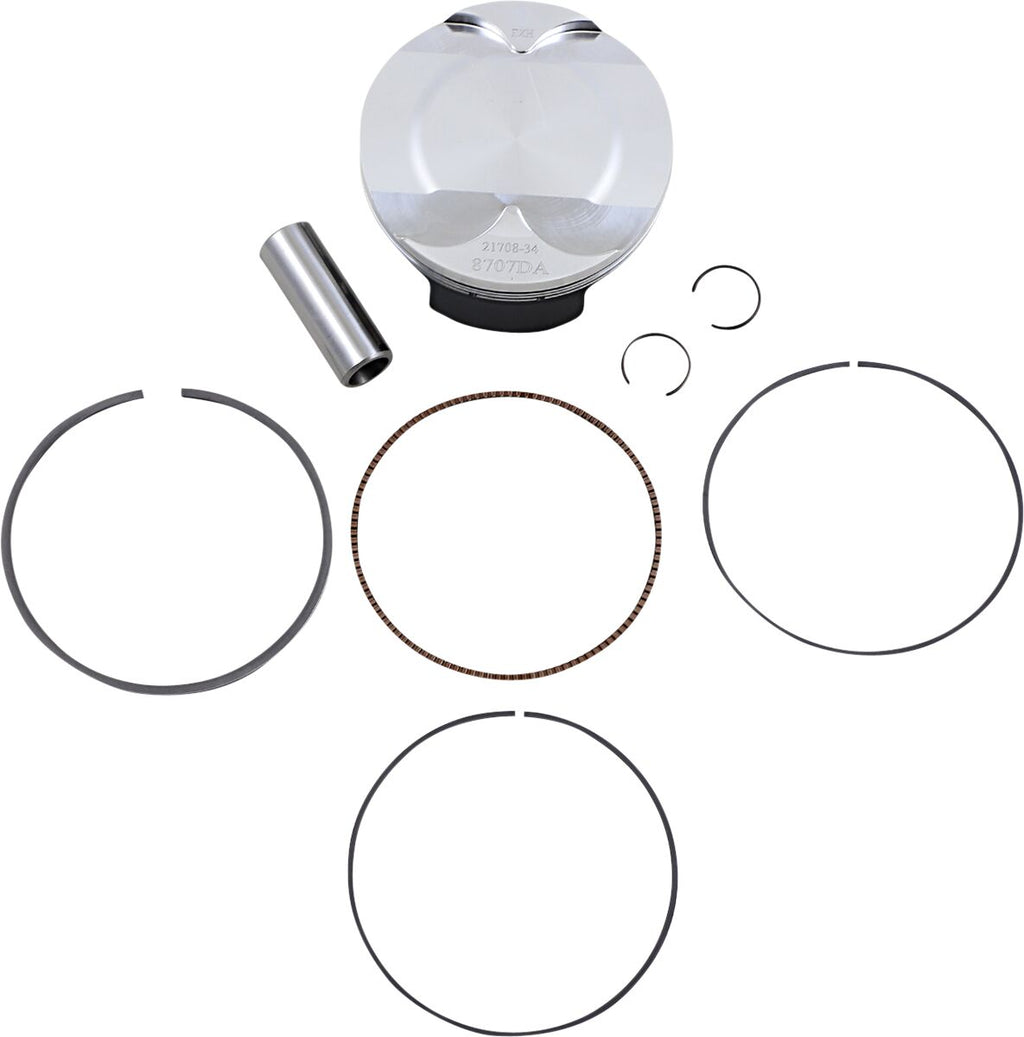 Piston Kit for 4 StrokeEnhanced piston pin oiling slots, radial boss machining, and annular grooves for improved wrist pin lubrication Lightweight piston with a tight piston wall clearance for a quieter running engine Skirt coated for reduced friction and improved break in performance Ring land treatment for improved ring seal and oil control Double bridged forging design where noted Kit includes piston, rings, wrist pin and pin locks Two ring design.
