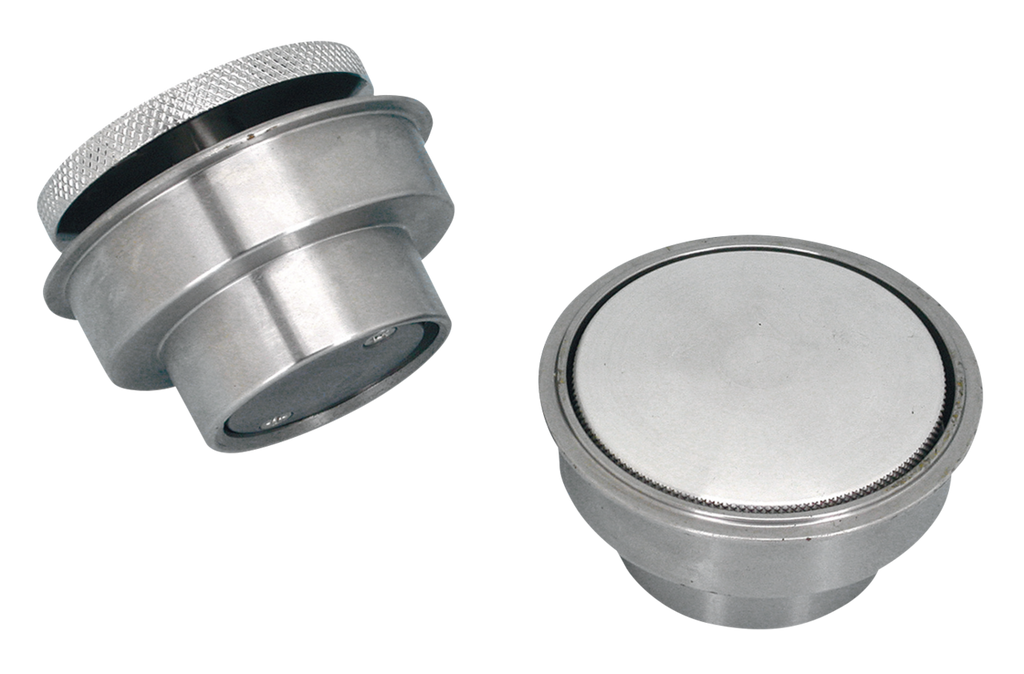 These "Pop-Up" gas caps allow you to give your gas tank that real Custom Smooth Top look, as seen by the worlds leading Custom Bike Builders. They are easy to open or close, just push in the cap, twist and the cap will pop up and is ready to unscrew. No matter if you have a steel or aluminum gas tank, Zodiac has these Custom goodies with your choice of aluminum or steel weld-in bung. Caps are vented and available in aluminum with a top-quality show chrome finish, polished Stainless Steel, or natural aluminum to apply the finish of your choice. Bungs have a 2 5/16" (59mm) outer diameter, caps are 55mm in diameter.