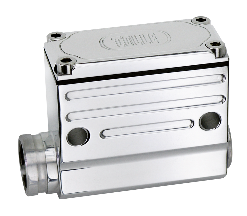 Kelsey-Hayes style master cylinder with a non-stock 14mm bore size, initially designed for use with Tolle's sprocket disc brake kit. Can also be used in many custom applications.