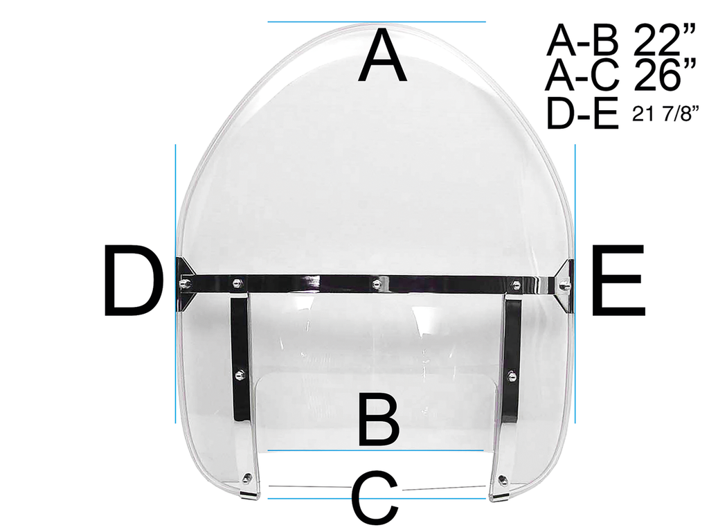 Replica windshield with pointed beaded edge top as found on Police style windshields. Comes complete with brackets and hardware. Screen is 21 7/8" (55.6cm) wide and 22" (56cm) high, measured from the top of the head light cut-out.