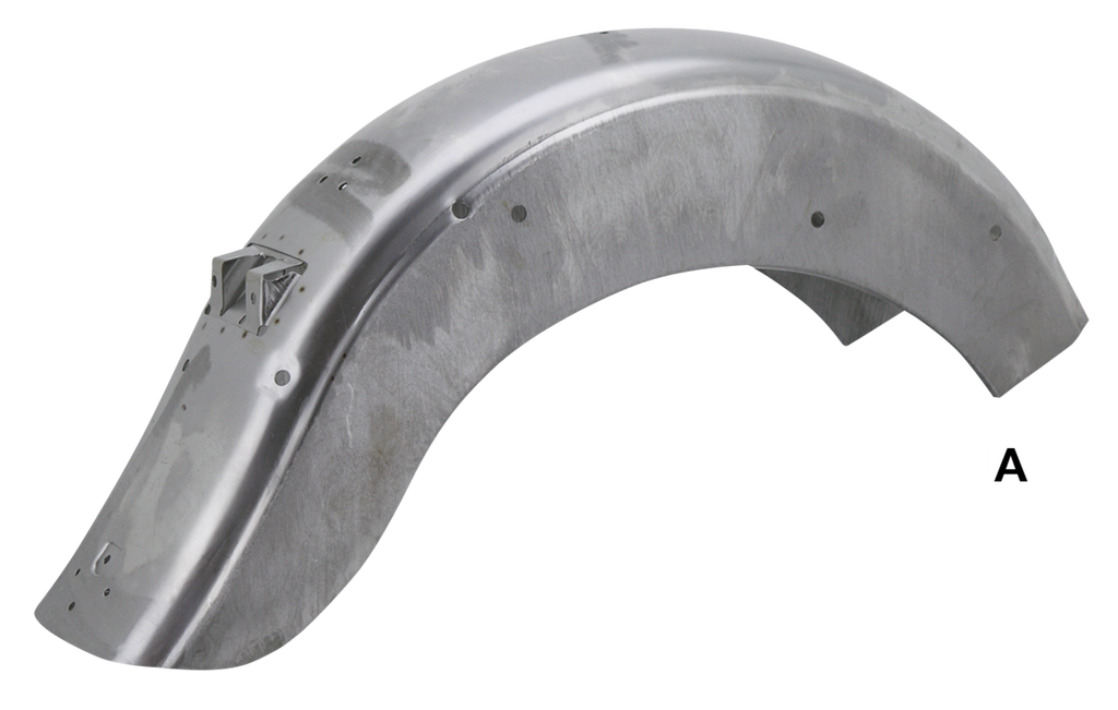 A close to the Original Equipment rear fender, but with a ridge line on the sides for a more classy appearance and increased strength. Features turn signal mounting holes already located and includes the taillight mount and fender reveal. This fender is ready to use as an OEM replacement part or for FXST models wanting to convert to full one-piece fenders. Also available in a custom version with only strut holes in it when custom taillights are desired. Unpainted.
