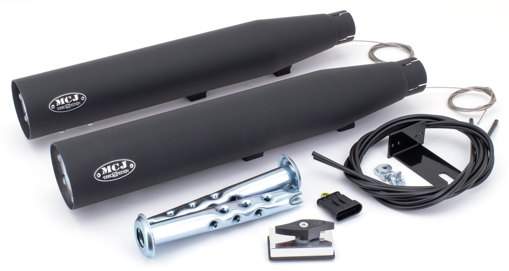 E-approved slip-ons with an adjustable exhaust valve that allows you to tune the sound of your bike the way you like it, but still get back to what is legal. These exhausts come complete with a manual operated adjusting lever that can be placed on either the handlebar or below the tank. Electric operated adjusting motors with a key fob style remote control are available as an option. Muffler end caps must be ordered separately.