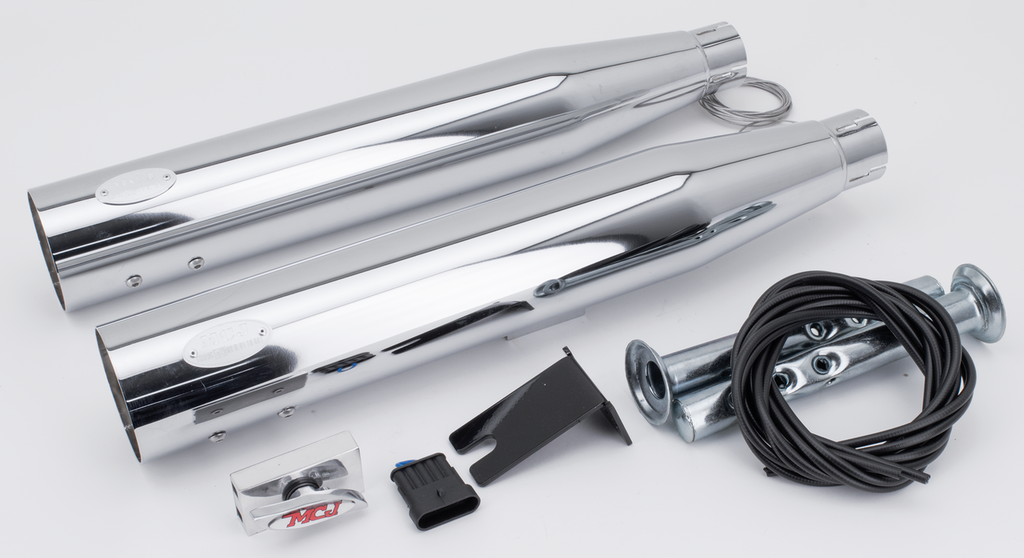 E-approved slip-ons with an adjustable exhaust valve that allows you to tune the sound of your bike the way you like it, but still get back to what is legal. These exhausts come complete with a manual operated adjusting lever that can be placed on either the handlebar or below the tank. Electric operated adjusting motors with a key fob style remote control are available as an option. Muffler end caps must be ordered separately.