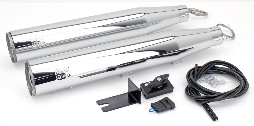 E-approved slip-ons with an adjustable exhaust valve that allows you to tune the sound of your bike the way you like it, but still get back to what is legal. These exhausts come complete with a manual operated adjusting lever that can be placed on either the handlebar or below the tank. Electric operated adjusting motors with a key fob style remote control are available as an option. Muffler end caps must be ordered separately.