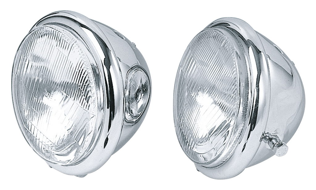 Complete assembled, Show-Chromed, Custom style headlights with bottom or side mount and with or without built-in blue high-beam indicator light.