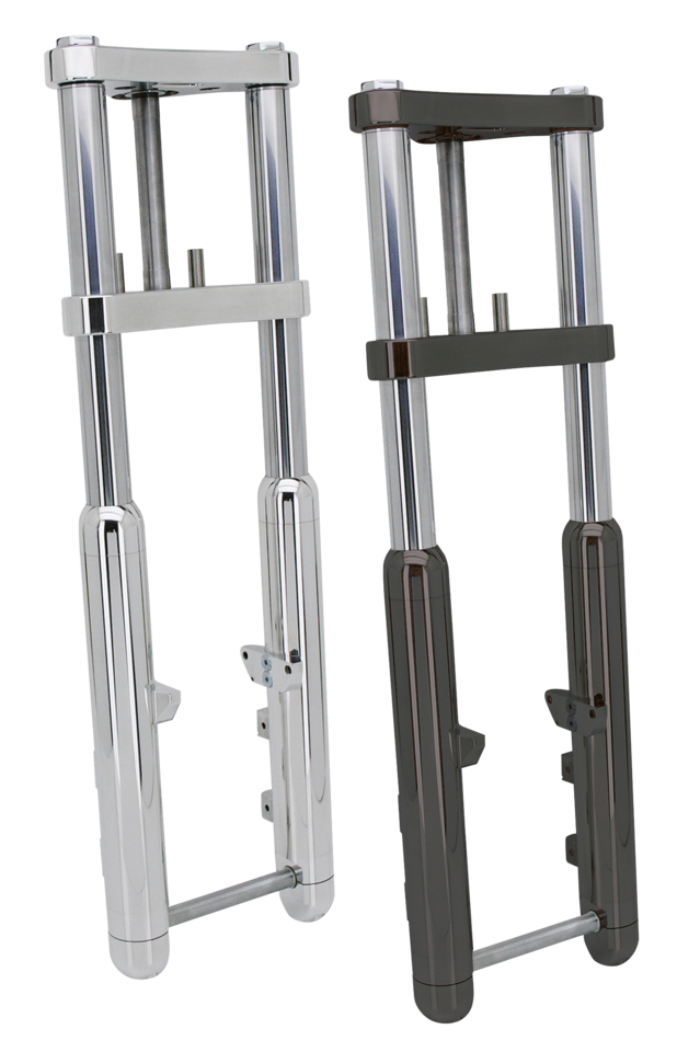 The guys at Zodiac noticed the trend of the latest custom bikes; Narrow is cool too. This resulted in a special Narrow version of the famous Bubba front fork called the Slim Bubba. With a pitch of 195mm it is just wide enough to take a Narrow Glide front hub and a stock or stock style brake caliper. Triple trees and sliders are billet aluminum with a mirror shine polished or polished black finish. With its classic round lines the fork has a nostalgic appearance, but with modern day handling characteristics. The upper triple tree clamp is 1 1/8" (29mm) thick, the lower triple tree clamp measures 1 5/16" (34mm). The fork sliders have a very impressive diameter of 2 3/8" (60mm), feature fender brackets and mounting blocks to take both left and right side calipers. Conversion brackets that take 1984-1999 style aftermarket calipers or 2000 to present style OEM or aftermarket brake calipers can be ordered separately. The front wheel axle has a hidden mount for extra sleek looks and the fork sliders are topped off with billet aluminum dust covers. Forks are available in various lengths and with 0, 3, and 6 degrees raked triple trees and include 3 different fork stops to work with almost any stock or aftermarket frame. A bottle of fork oil is included with each set. Installation on 2006-2017 Dyna requires the separate purchase of a longer neck post ZPN 600126.