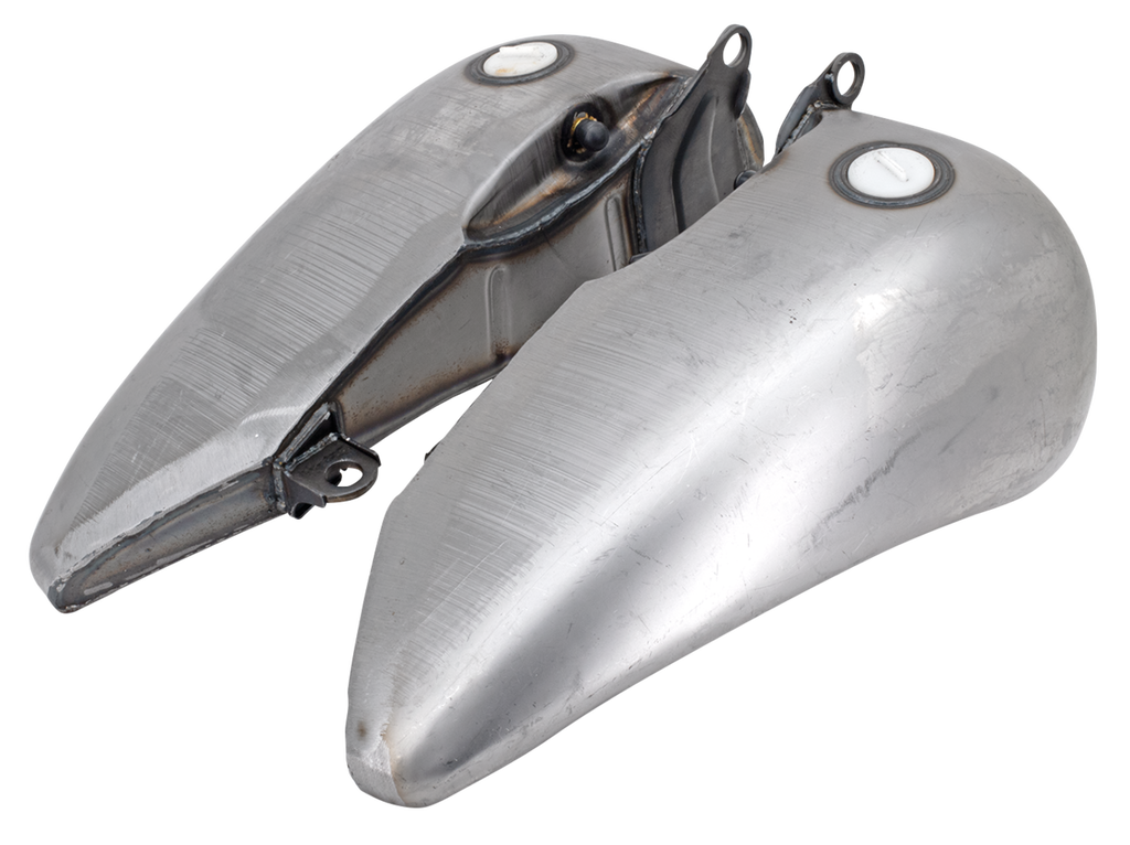 These split stretched gas tanks will give your Softail that long, slippery stretched look associated with the top Custom bike builders. The stretched section is not a weld-on piece but an actual part of the tank. The exclusive stretched Zodiac tanks are the only one-piece steel tank available. Its design will give your bike smooth flowing lines and a very classy look. Due to the sleek design a narrow seat (like our Silhouette seats) must be used, stock seat may not fit. Fits all Softail models 1984 thru 1999. Available with Screw-In type gas caps, Quick Cam lockable flush or a set of our small chrome plated aluminum Aero-style gas caps. Gas caps are separately available.