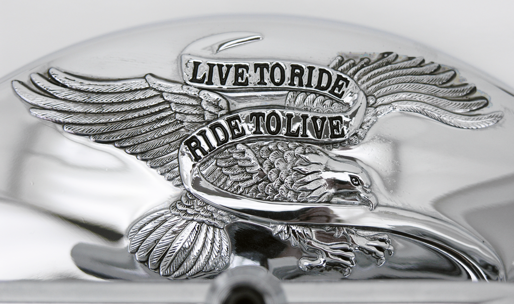 Chrome plated oval Slimline mirror with visor. Features an embossed "Live to Ride" logo on the back. Can be used on left or right side.
