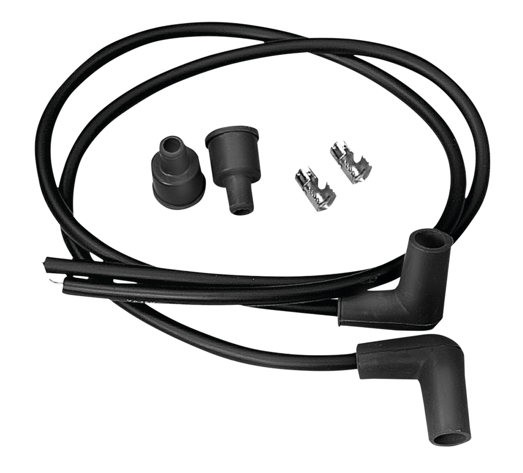 20" long (50 cm) with spark plug cap. Will fit any coil with "plug-in" connector as used on Harley's. Also fits our dual lead coils (non resistor type) (OEM 31981-65B).