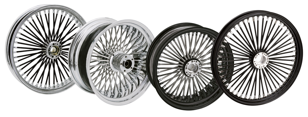 The original Fat 50, also known as Fat Daddy wheels, are made in the USA and are radial laced with straight 3/8" (9.5mm) diameter stainless steel spokes with custom nipples, have billet aluminum custom hubs and steel rims. Available as complete wheels with your choice of chrome or black hub, chrome or black rim, polished or black stainless steel spokes and chrome spoke nipples. All wheels, except in 19x2.15" and 21x2.15", come sealed for use with Tubeless tires. The 4.25" wide rear wheels fit most applications by modifying the axle spacers and changing the rotor and pulley spacing. Other wider than stock rear wheels are for use with custom wide swing arms and offset parts found elsewhere in the Zodiac Bikers Book. Front wheels for Softail models are single flange for use with single disc brake rotor. All other wheels are dual flange. Front for use with dual disc brake rotors and rear for disc brake rotor and pulley.