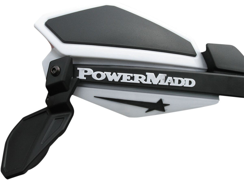 Star Series MirrorStar series handguard mirrors attach directly to your handguards with a few simple steps and even work with PowerMadd extensions and hand wrap kit (fixed mount only) 360° rotating mirrors provide a full view of the trail behind you Provide a rear view without modifications to your machine These mirrors also fit the new Polaris snowmobile handguards that have a similar look and shape to the PowerMadd Star Series.