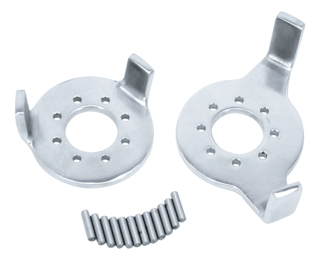 These stainless steel steering stops are great when you install an aftermarket triple tree or front fork in a stock or aftermarket frame. Prevents your forks from damaging the gas tank. These steer stops are installed on the lower triple tree, under the steering head bearing. Just drill 4 holes in the triple tree using the steer stop as a jig and secure the steer stop with the 4 provided pins. Available in two versions, type A for use in FXR, Sportster and Dyna style frames, type B for use in Hardtail, Duo Glide and Softail style frames.
