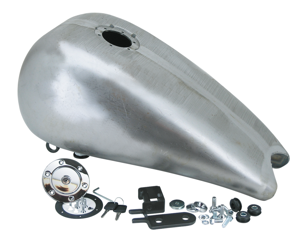 This one-piece 3" stretched gas tank has a smooth top and includes a single midi aero locking gas cap. This tank gives your bike the same kind of styling as with the aluminum gas tanks, but at a much more economical price. The rear of the tank has a cut-out to match with most narrow seats. Tank holds approx. 3.8 gallon (14,4L.)
