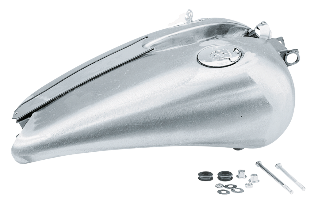 This one-piece stretched gas tank has a proper dash mount, and gives your Dyna the long, stretched look and flowing lines found on the one piece stretched tanks, together with that classic dash look. The stretched section is not a weld-on part but an integral part of the tank and has a seat pocket to go with most narrow seats. Tanks hold approx. 4.2 gallon (15,9L.) of fuel and are available with dual Screw-In type gas caps as well as dual Quick Cam lockable flush mount gas caps. Fits 1991 thru 2005 carburetor equipped Dyna.