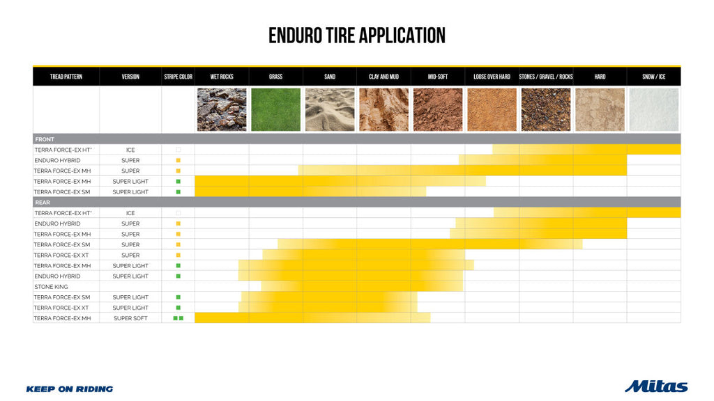 • Identified by the characteristic yellow stripe is ideal for higher speed, higher mileage or heavy load use (i.e. - hare scrambles, desert racing)